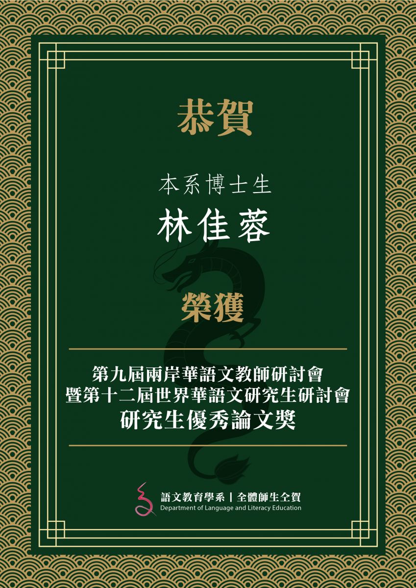 賀!本系博士生林佳蓉榮獲第九屆兩岸華語文教師研討會暨第十二屆世界華語文研究生研討會-研究生優秀論文獎