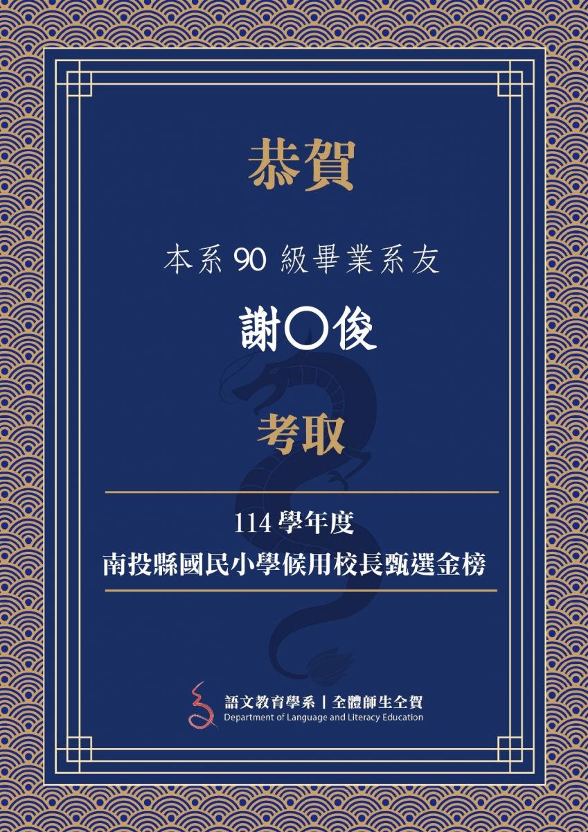 賀 ! 本系90級畢業系友 謝O俊 考取南投縣114學年度國民小學候用校長甄選金榜