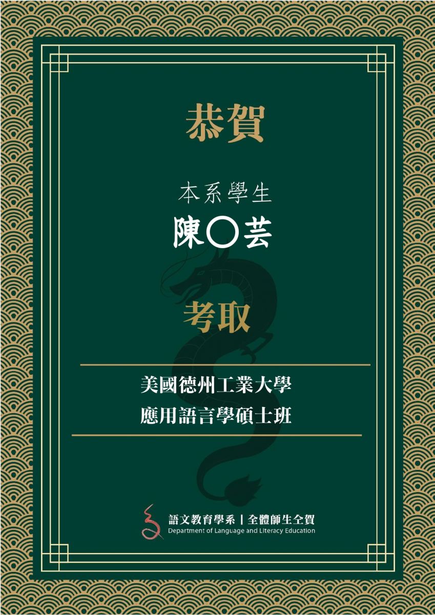 賀!本系115級畢業生陳○芸 考取美國德州工業大學應用語言學碩士班